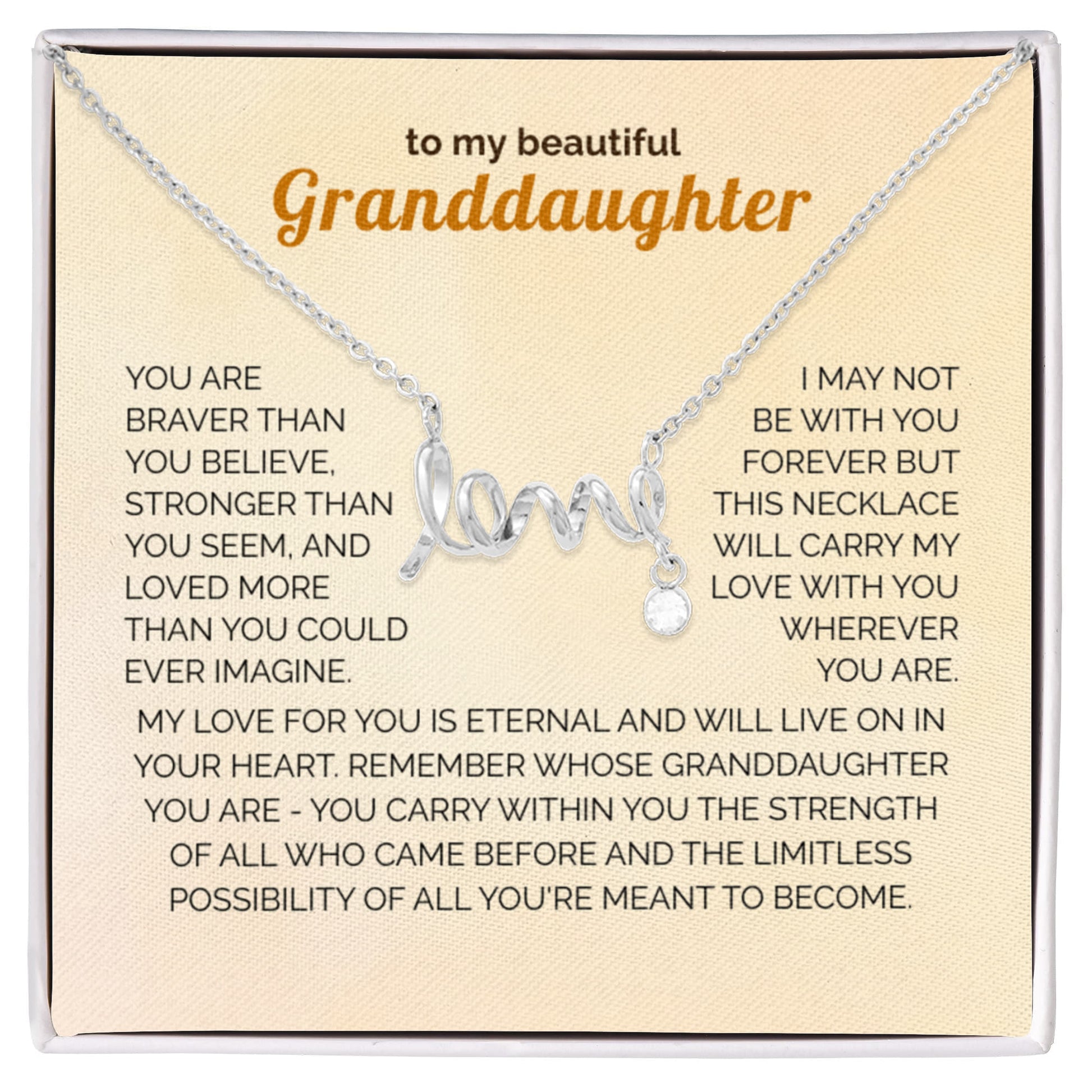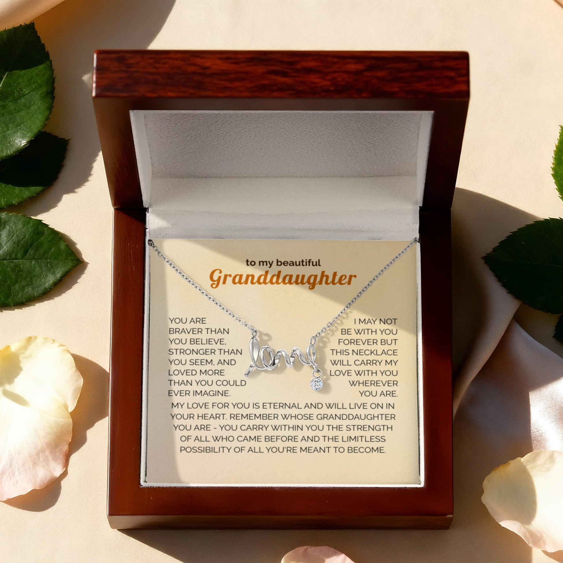 Surprise your granddaughter with a keepsake she’ll treasure forever. Imagine her eyes lighting up as she opens the box and discovers this beautiful “Love” necklace — a heartfelt symbol of the unbreakable bond you share. 💖✨
