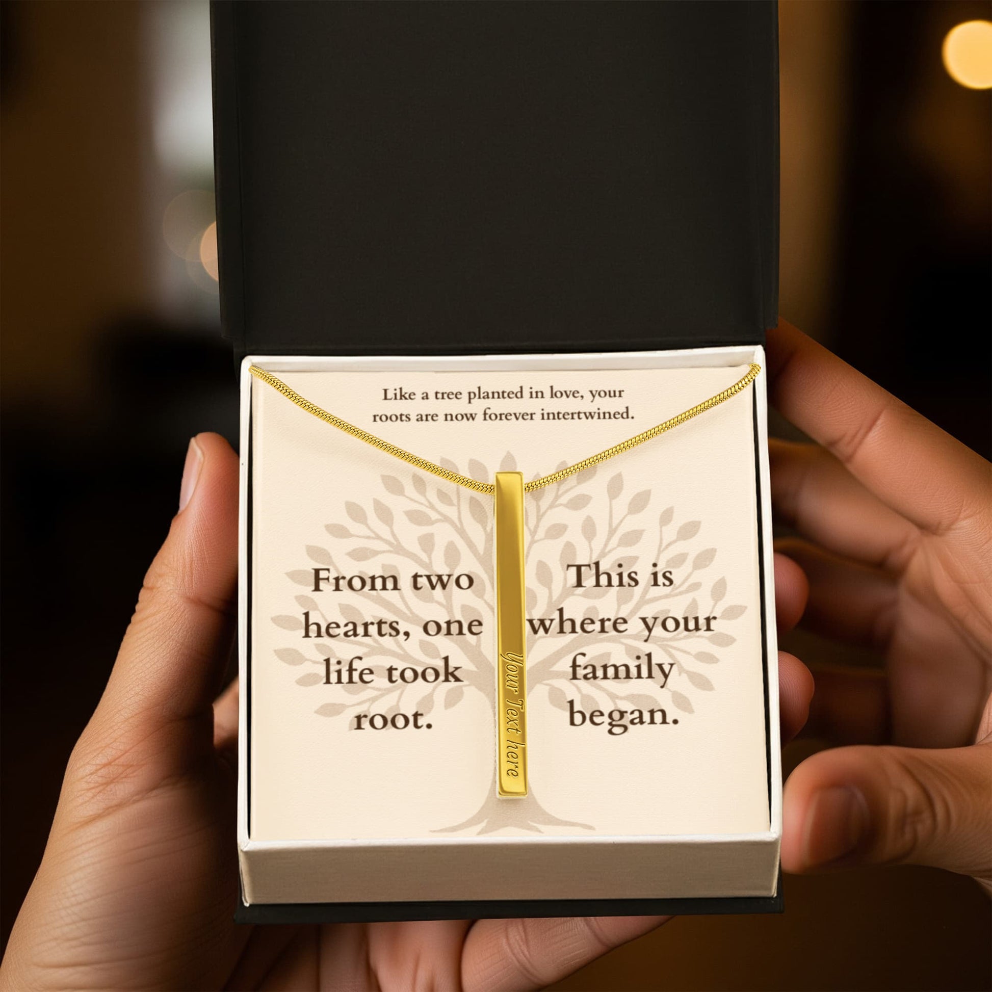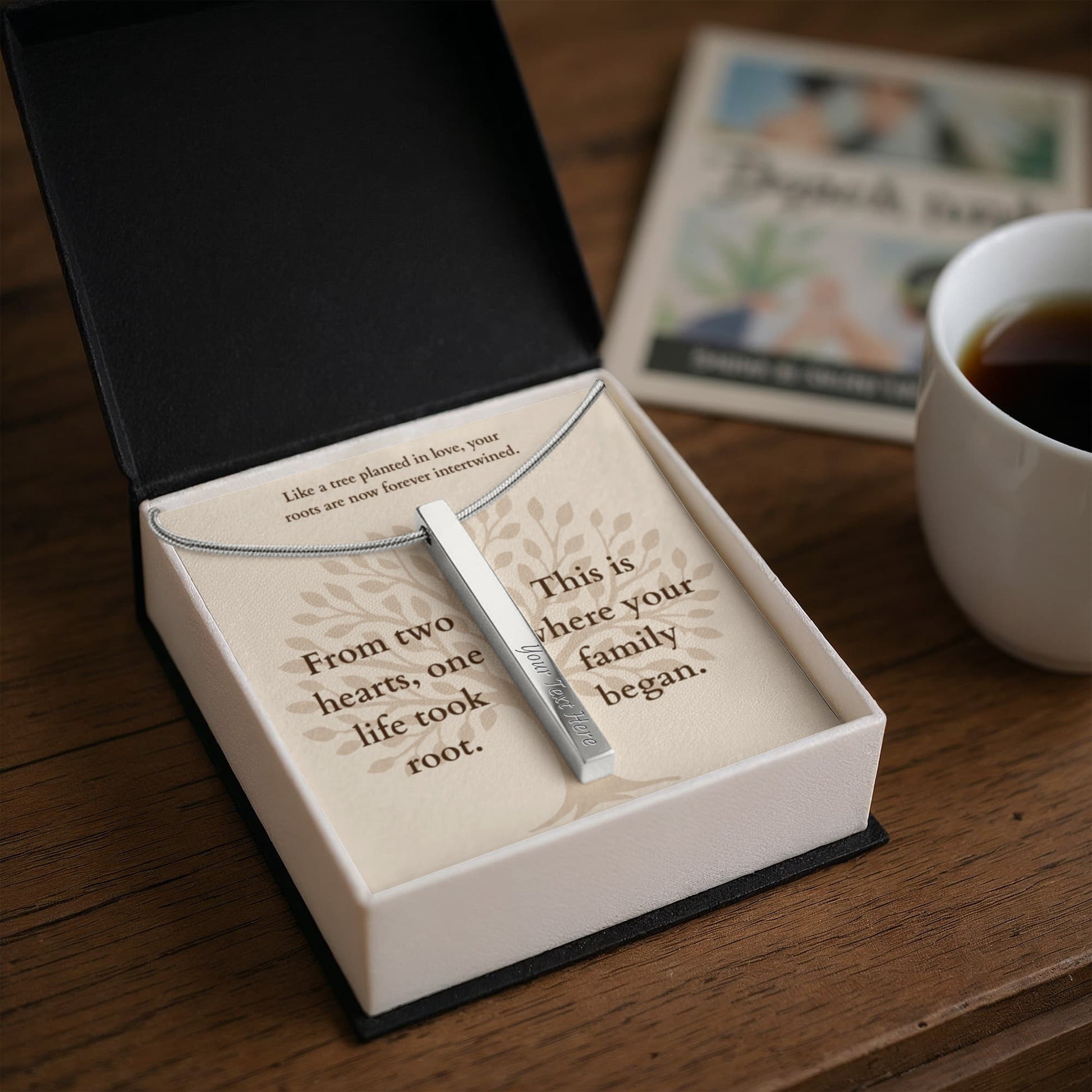 Celebrate the beginning of your family's story with this beautifully crafted Personalized Family Tree Necklace—a meaningful keepsake designed especially for new parents. Featuring a sleek vertical pendant engraved with your child’s name, your names as parents, and the date that changed everything, this necklace symbolizes the moment your family tree began to grow.