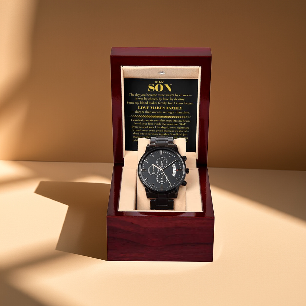 Watch for Adopted Son from Dad — “Love Makes Family” Adoption Keepsake Gift — Sentimental Father to Son Gift — Black Chronograph Watch